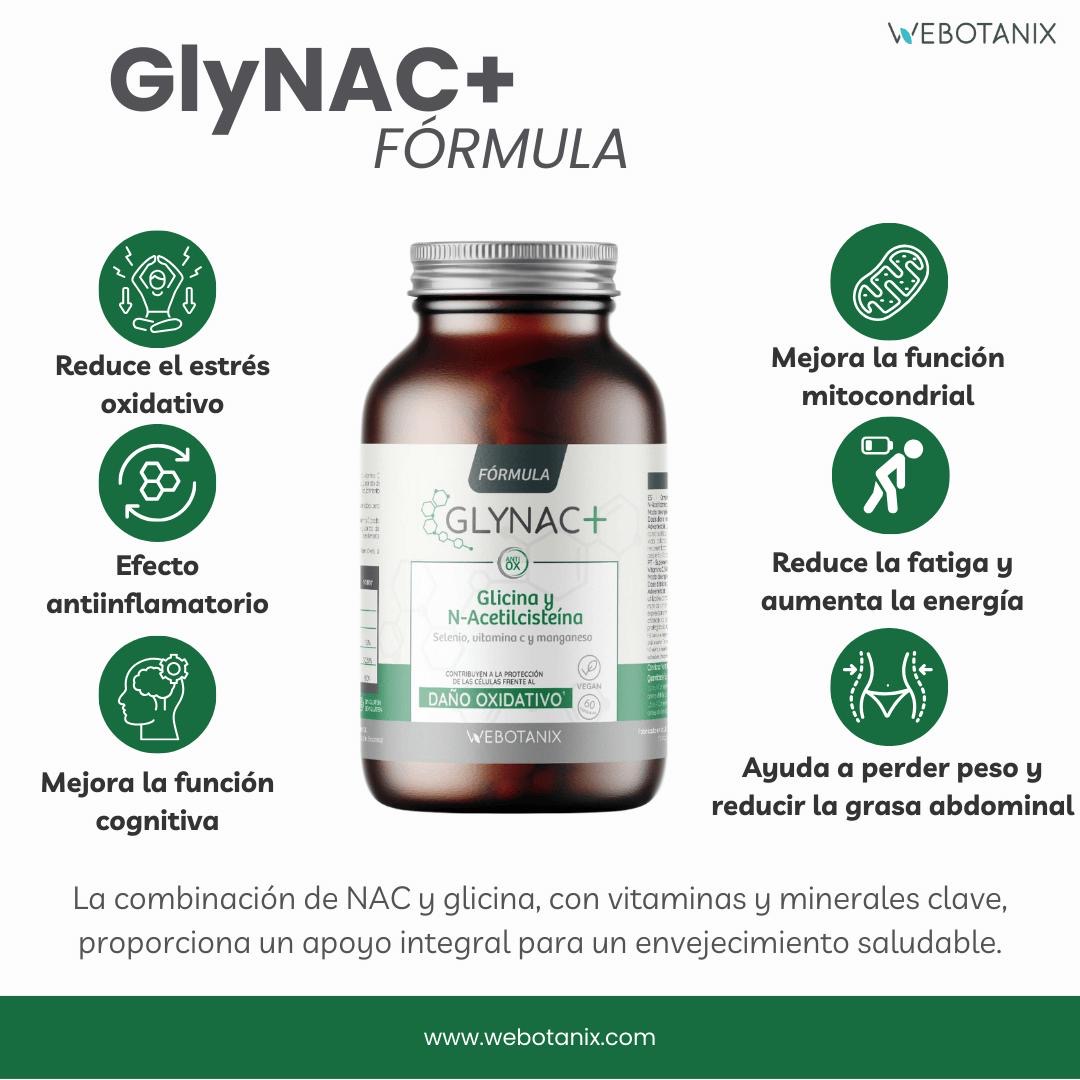 GlyNAC+ es un complemento alimenticio con N-acetilcisteína (NAC) y glicina, dos aminoácidos esenciales para la producción de glutatión, el antioxidante más poderoso del cuerpo.